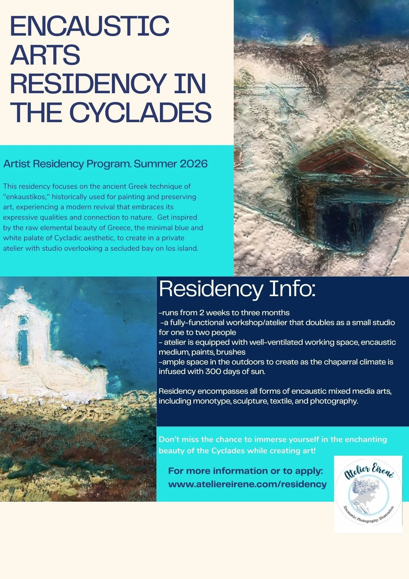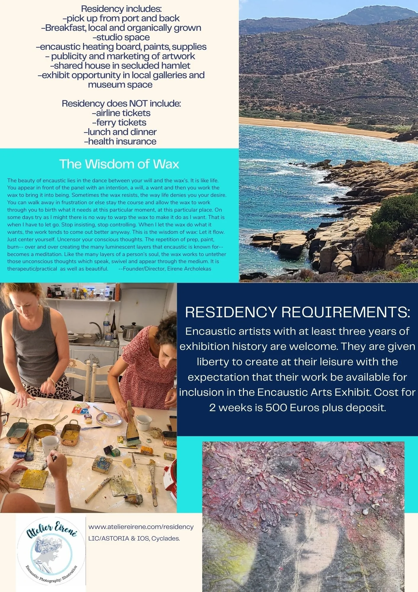 The ancient Greek technique of “enkaustikos” used the four elements: fire, earth (pigments), water (wax) and air to waterproof ships and paint statues in vibrant colors. This versatile medium has made a comeback in the post-modern world. What better place to explore this medium than on the ancient islands it was used! Get inspired by the raw elemental beauty of Greece, the minimal blue and white palate of Cycladic aesthetic to create in a private atelier with studio overlooking a secluded bay on the island of Ios, known for its fabulous beaches.